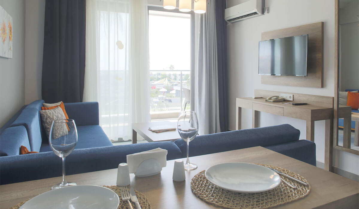 Our rooms are 35 square meters, comfortable single or double beds, safe box, water heater, telephone, tea-coffee machine, smart TV (to use Youtube etc. applications) hair dryer, make-up mirror, air conditioning in all rooms, kitchen (in some rooms), kitchen supplies (in some rooms) sitting group (in some rooms), shower, wc, mini fridge, shampoo, shower gel, conditioner. The floors of our rooms are covered with elegant ceramics. All rooms have a balcony. Wifi is available free of charge in the rooms and public areas. In addition, thanks to the wifi interface we use in our facility with your smart phones, you can contact the guest representative about all your requests and requests and have your orders come to your room via your phone.