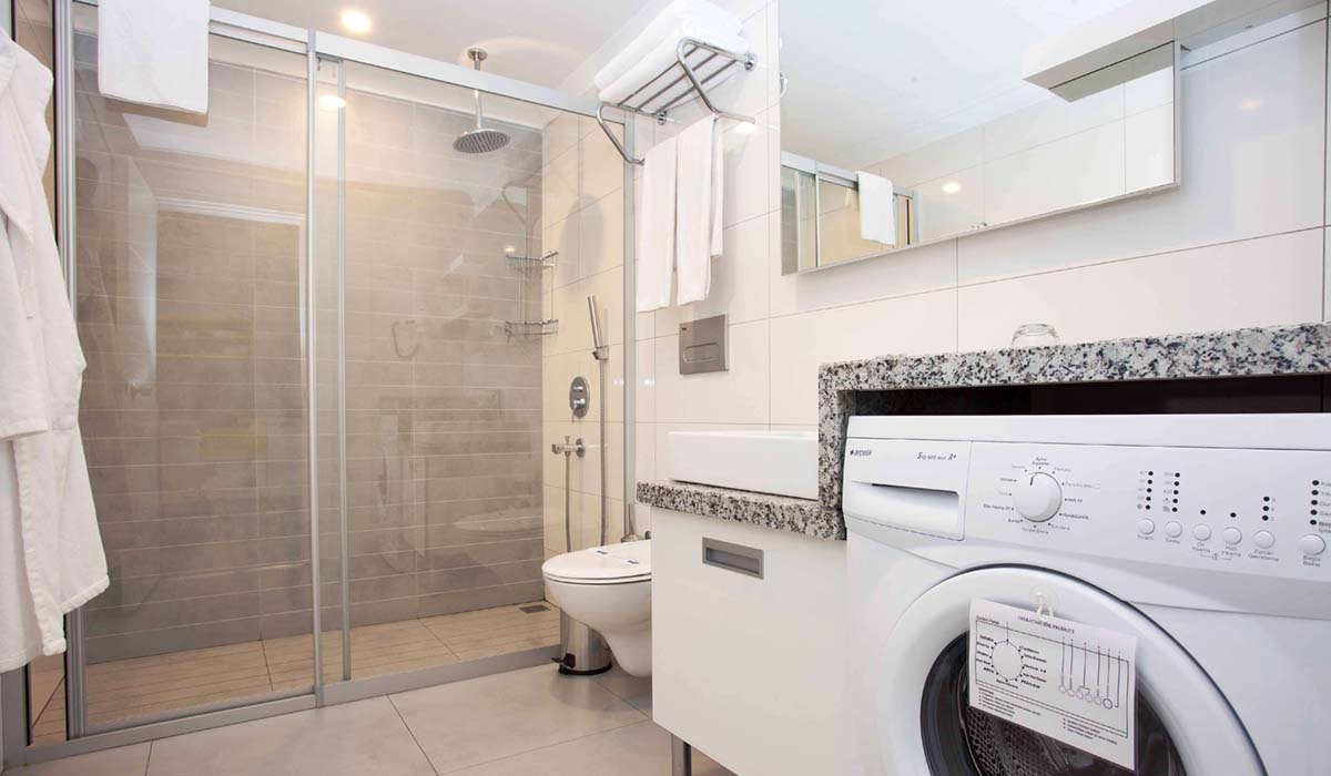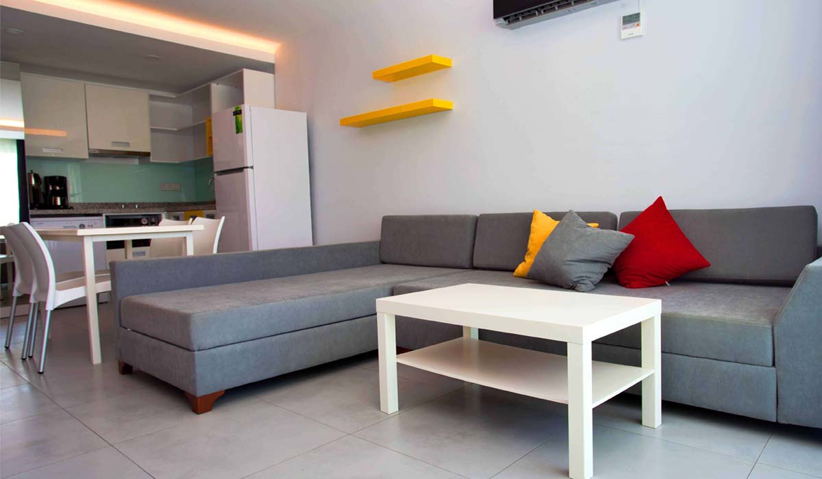 Our rooms are 44 m² and have comfortable single or double beds, safe box, water heater, telephone, tea and coffee machine, Led TV hair dryer, make-up mirror, air conditioning in all rooms, kitchen, kitchen equipment, sitting group, shower, wc, refrigerator, laundry. machine, micro wave oven, cooker, vacuum machine, iron and ironing board, shampoo, shower gel, conditioner. The floors of our rooms are covered with elegant ceramics. Wifi is available free of charge in the rooms and public areas. In addition, thanks to the wifi interface we use in our facility with your smart phones, you can contact the guest representative about all your requests and requests, and have your orders come to your room via your phone.